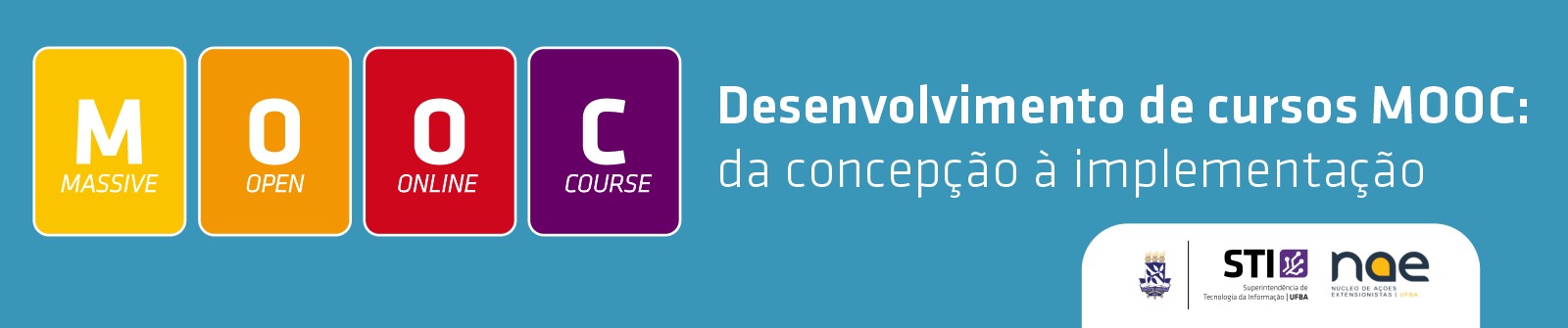 O curso Desenvolvimento de Cursos MOOC: Da Concepção à Implementação foi idealizado pelo NAE - Núcleo de Ações Extensionistas/STI/UFBA no sentido de contribuir com os professores e outros profissionais interessados em compreender os cursos livres (MOOC), aprender a utilizar a plataforma Moodle e desenvolver cursos MOOC nesta plataforma, desde sua concepção até a avaliação.